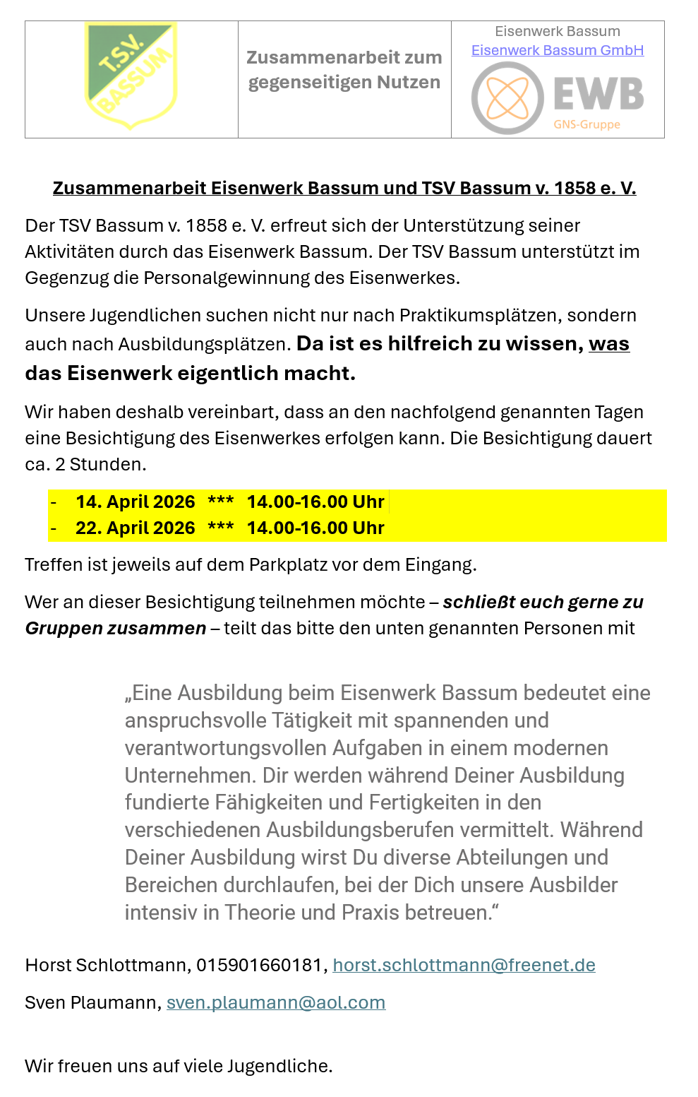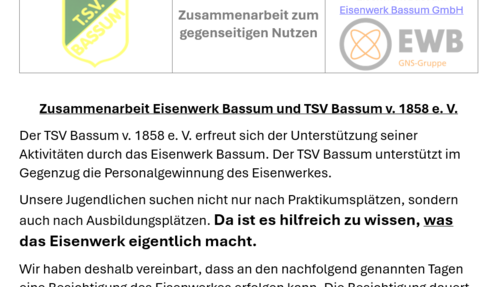 Der TSV Bassum v. 1858 e. V. erfreut sich der Unterstützung seiner Aktivitäten durch das Eisenwerk Bassum. Der TSV Bassum unterstützt im Gegenzug die…