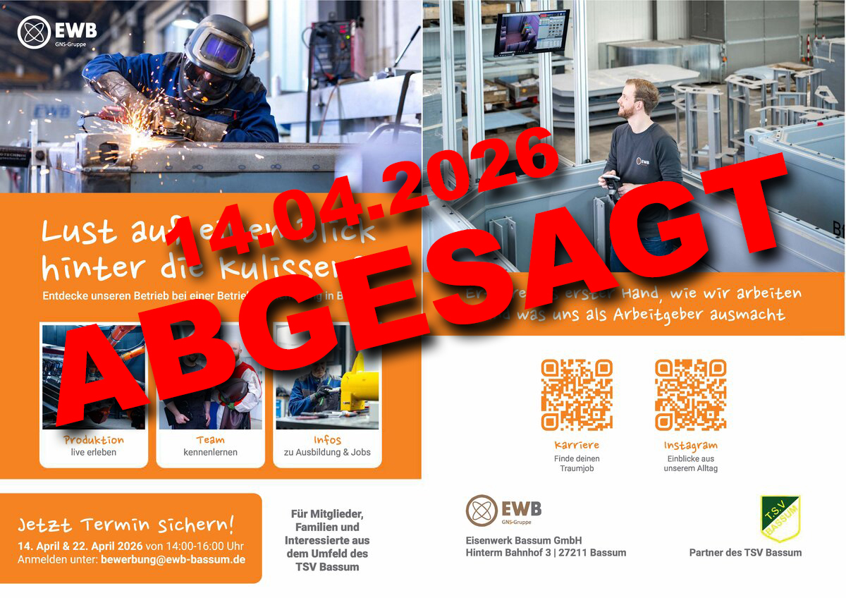 Am 20. März 2026 lädt der TSV Bassum zur diesjährigen Mitgliederversammlung ein – Beginn ist um 19.00 Uhr im Vereinskeller. Neben Berichten, Ehrungen…