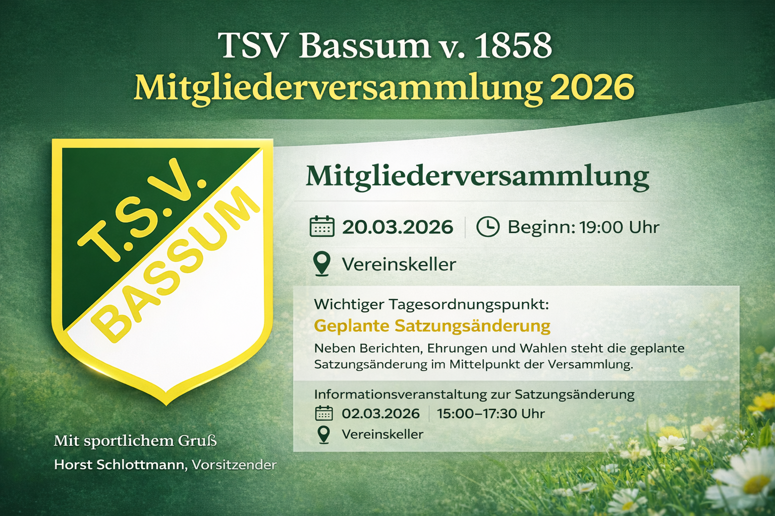 Am 20.03.2026 findet unsere diesjährige Mitgliederversammlung statt. Sie beginnt um 19.00 Uhr im Vereinskeller.